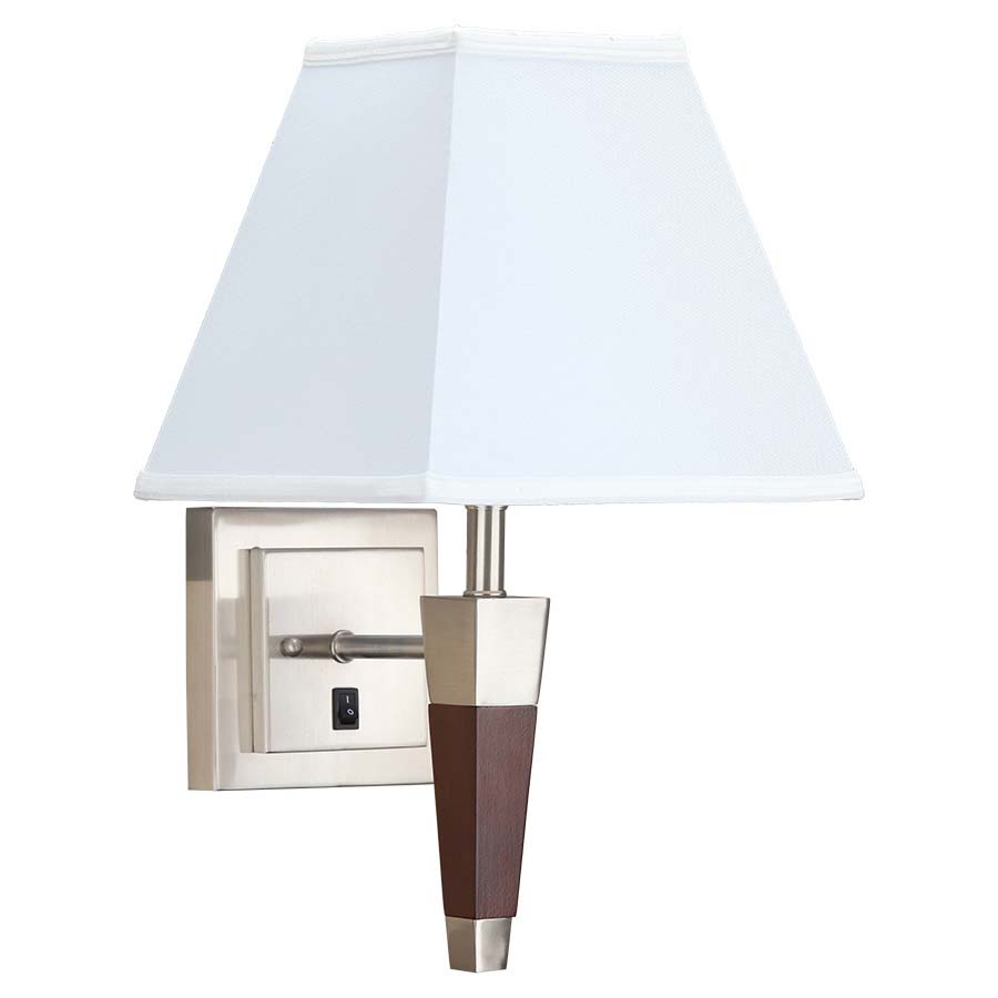 17" Walnut with Brushed Nickel accents Single Wall Lamp, medium base socket, on/off rocker switch at back plate, 8' Silver 45° Cord, 5x5x10x10x9 White Linen Hardback Shade. 24" Cordcover. Recommend 800 lumen LED bulb.