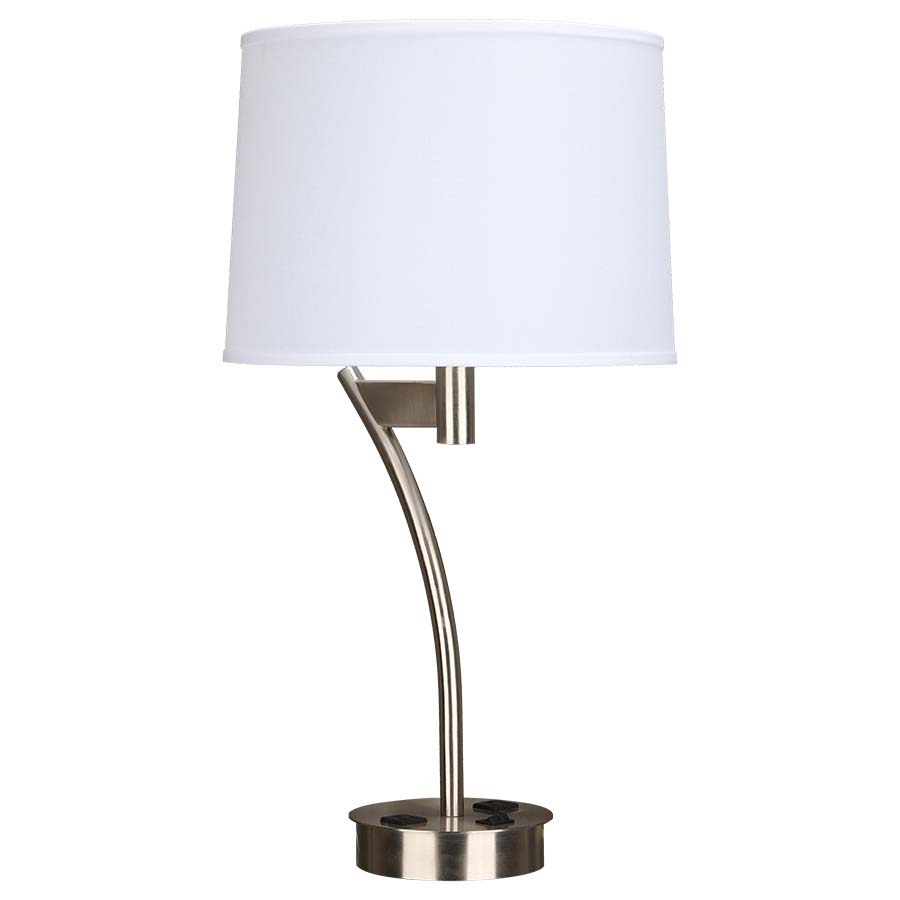 26"H Brushed Nickel Table Lamp, Dual Socket, dual on/off rocker base switch, 8' Silver 45° 3-prong grounded cord, two convenience outlets, 13x14x10 White Linen Hardback Shade. Recommend two 800 lumen LED bulb.