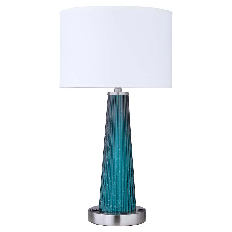 27.5" Brushed Nkl Table Lamp with Seafoam Seeded Glass Column, medium base skt, on/off rocker base switch, one outlet, twoUSB ports,8'Silver 45° 3-prg grounded cord, 15x15x10 Cream Linen HB Shade with top& bottom diffusers. Recommend 1100 lumen LED bulb.