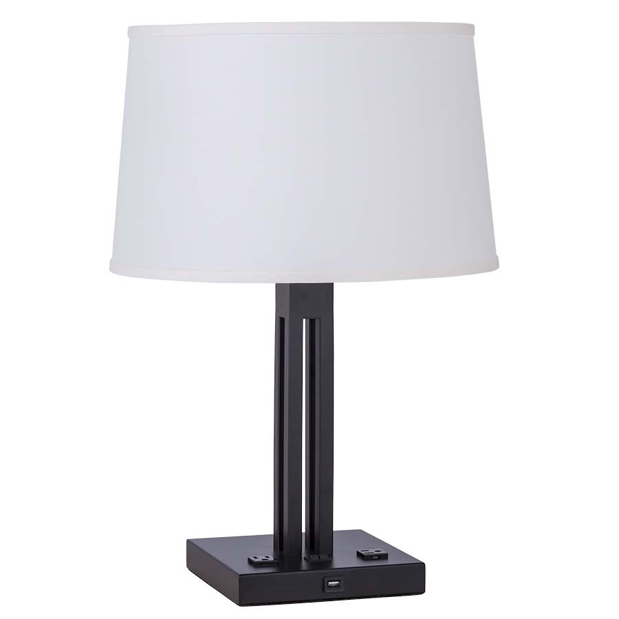 23"H Espresso Table Lamp, dual socket, dual on/off rocker base switch, two outlets, 8' Silver 45° 3-prong grounded cord, 14"x16"x10" Parchment Linen Hardback Shade, 9"Harp & Finial, recommend two 1100 lumen LED bulbs (does not have USB as shown in picture)
