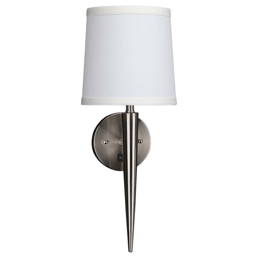 18" Brushed Nickel Single Wall Lamp, medium base socket, on/off rocker switch at backplate, 8' Silver 45° cord. With 6"x7"x7" Cream Linen Hardback Shade. Recommend 1100 lumen LED bulb.