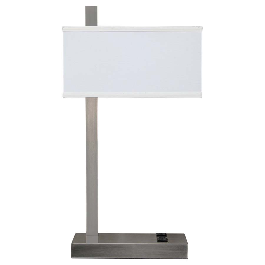 25" Brushed Nickel Table Lamp, one GU24 socket, on/off rocker base switch, two outlets, 8' Silver 45°3-prg grounded cord, (4x13.5)x(4x13.5)x7 Cream Linen shade, White Frosted Acrylic top and bottom diffusers. Recommend 1100 lumen LED bulb with GU24 base