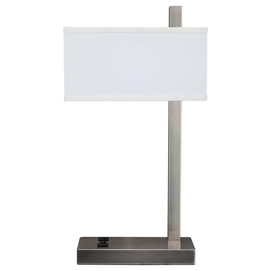 25" Brushed Nickel Table Lamp, one GU24 socket, on/off rocker base switch, two outlets, 8' Silver 45°3-prg grounded cord, (4x13.5)x(4x13.5)x7 Cream Linen shade, White Frosted Acrylic top and bottom diffusers. Recommend 1100 lumen LED bulb with GU24 base