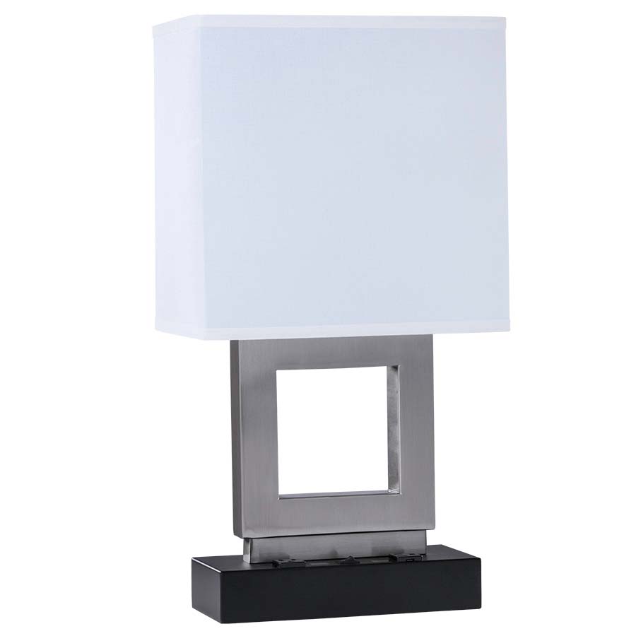 24" Square Brushed Nickel and Black Table Lamp, medium base socket, on/off rocker base switch, 8' Silver 45° 3-prong grounded cord, two convenience outlets, with 8"x12"x8"x12"x12" Rectangle White Linen Hardback Shade. Recommend1100 lumen LED bulb.