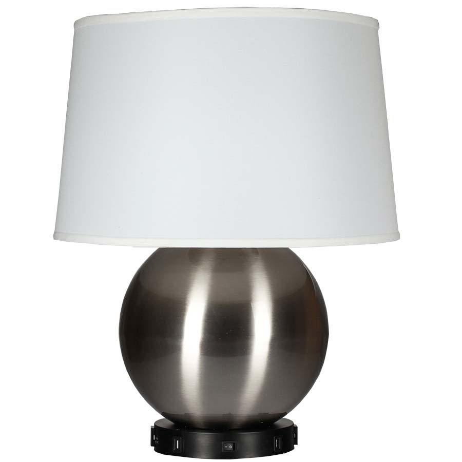 24" Brushed Nickel and Oil Rubbed Bronze Table Lamp, medium base socket, two convenience outlets and two USB ports, on/off rocker base switch, 8' Silver 45° 3-prong grounded cord, 15x19x11 Cream Linen hardback shade. Recommend 1100 lumen LED bulb.