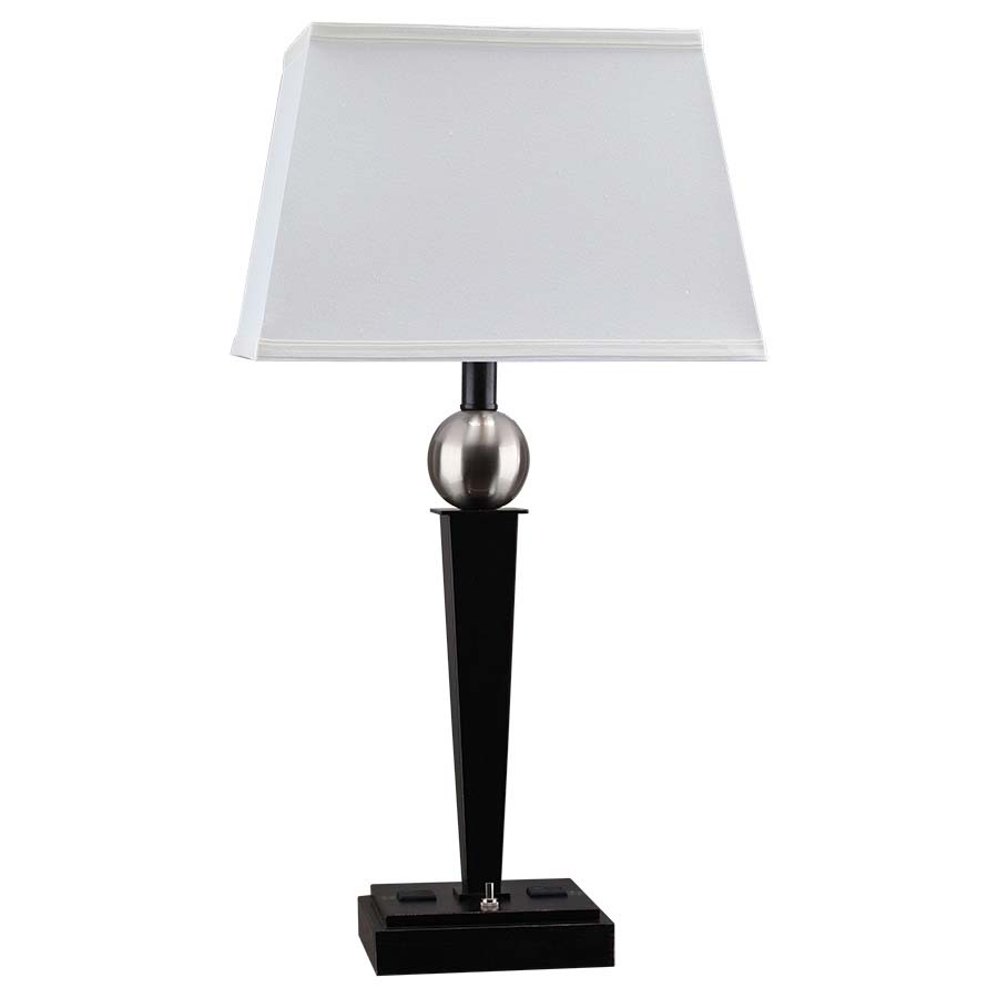 26.25" Oil Rubbed Bronze Table Lamp with Brushed Nickel accents, two medium sockets, 3-way push button base switch, two outlets, 8' Silver 45°3-prong grounded cord, 9x10.5x12x13.5x9 Cream Linen Hardback Shade. Recommend two 1100 lumen LED bulbs