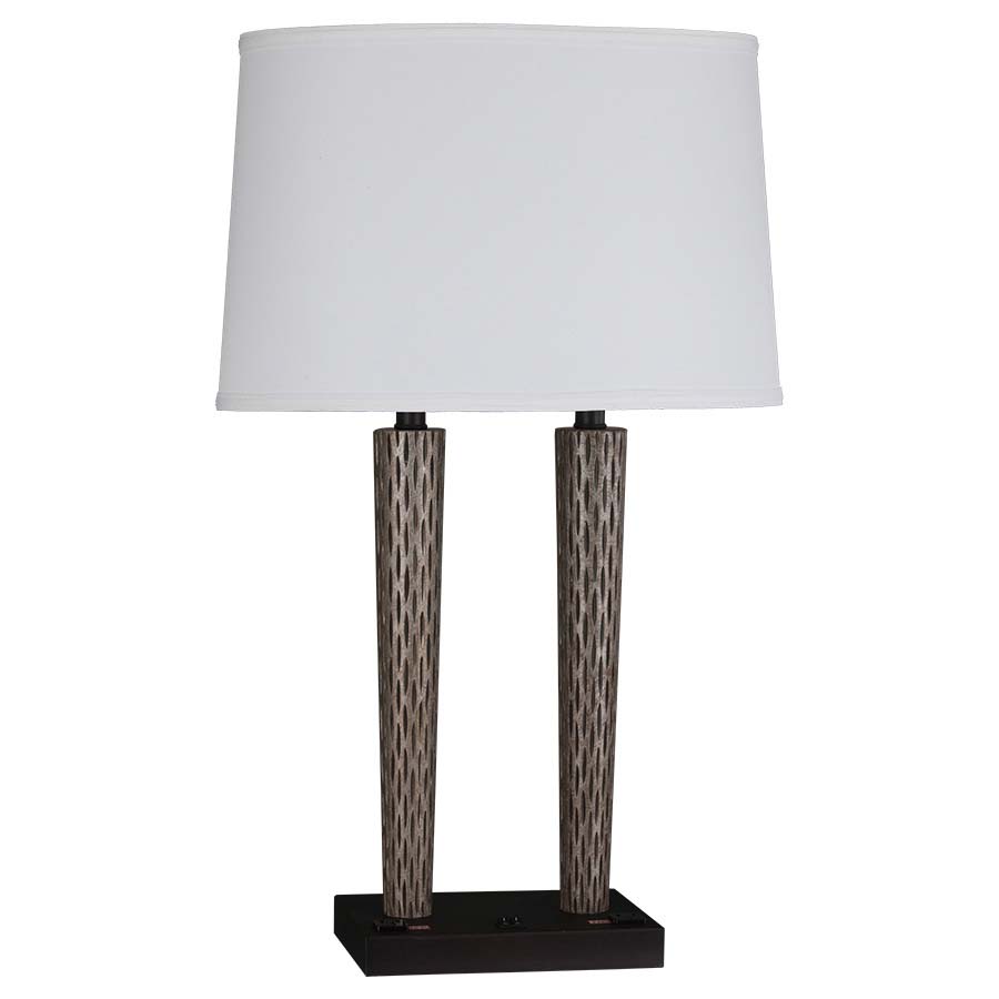 30" Dark Walnut and Silver Table Lamp, dual medium base socket, dual on/off rocker base switch, 8' Silver 45° 3-prong grounded cord, two outlets, 9"x16"x10"x17.5"x12" Oval Cream Linen Hardback Shade. Recommend two 1100 lumen LED bulbs.