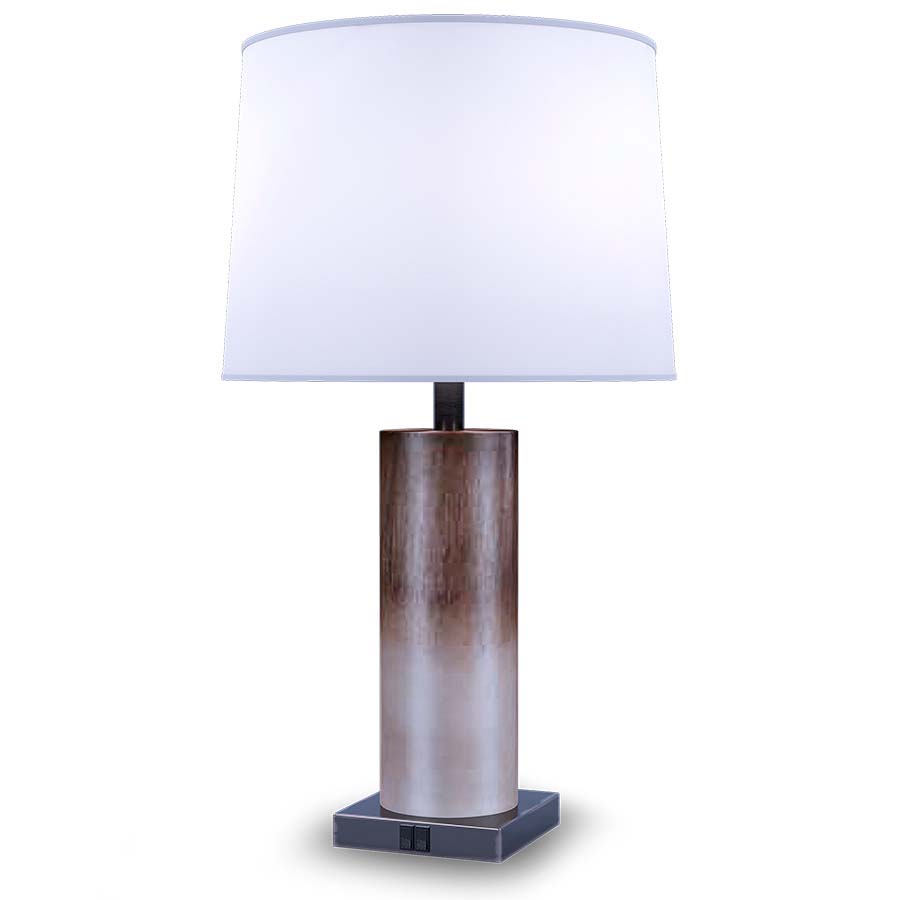 27"H Beige Onyx and Burnished Bronze Table Lamp, medium base socket, on/off rocker base switch, two outlets, 8' Black 45° 3-prong grounded cord, with 14"x15"x10" White Linen Hardback Shade. Recommend 1100 lumen LED bulb.