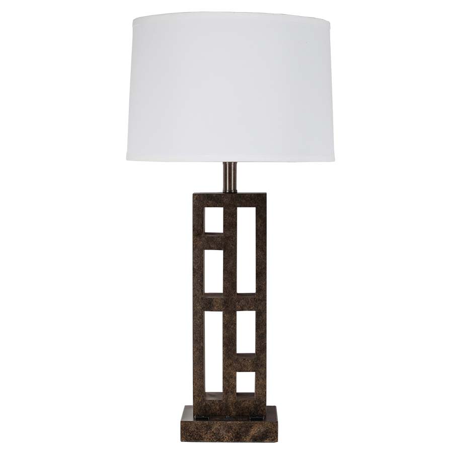 31.5"H Kallispell Bronze Table Lamp, dual medium base socket, one on/off rocker base switch, 8' Silver 45° 3-prong grounded cord, with two convenience outlets, 14x15x10 Cream Linen Hardback Shade. Recommend two 1100 lumen LED bulbs.