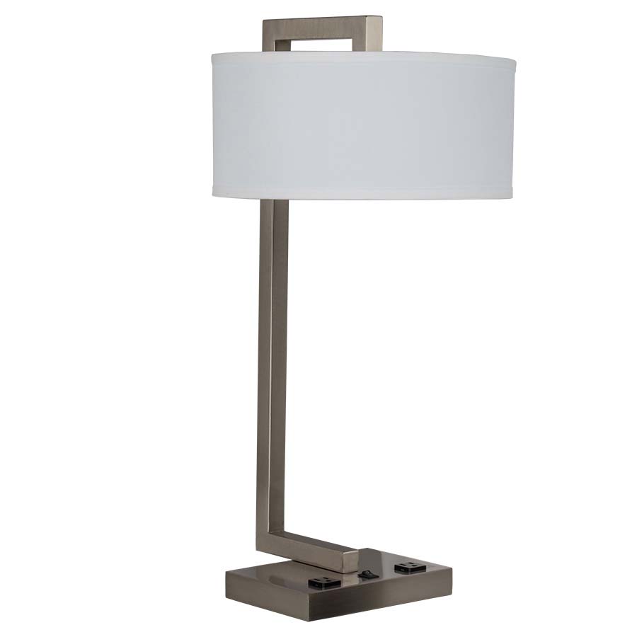 26" Brushed Nickel Table Lamp, dual medium base socket, one on/off rocker base switch, two outlets, 8' Silver 45° 3-prong grounded cord, 11x14x11x14x6 White Linen Hardback Shade. Recommend two 1100 lumen LED bulbs.
