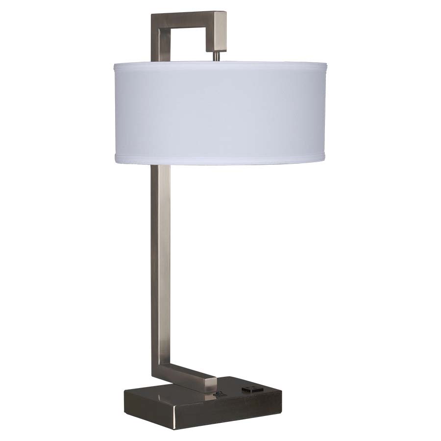 26" Brushed Nickel Table Lamp, dual medium base socket, one on/off rocker base switch, one convenience outlet, 8' Silver 45° 3-prong grounded cord, 11x14x11x14x6 White Linen Hardback shade. Recommend two 1100 lumen LED bulbs.