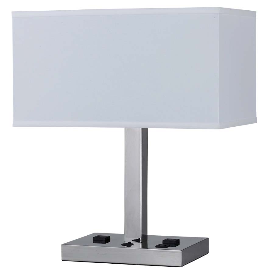 20" Polished Nickel Table Lamp, dual medium base socket, one on/off rocker base switch, two outlets, dual usb port, 8' Silver 45° 3-prong grounded cord, 10x17x10x17x9 Rectangle White Linen Hardback Shade. Recommend two 1100 lumen LED bulbs.
