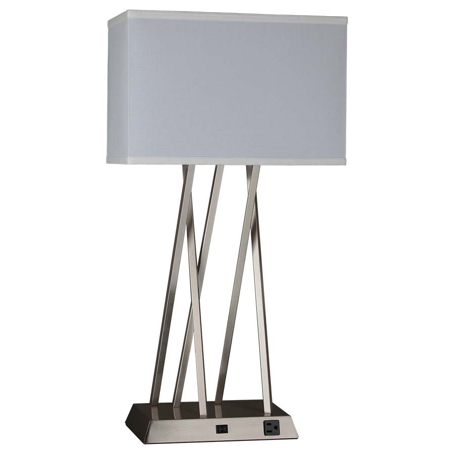 28.5"H Brushed Nickel Table Lamp, medium base socket, on/off rocker base switch, one outlet, 8' Silver 45° 3-prong grounded cord, 8x15x8x15x10 White Linen Hardback Shade Recommend 1100 lumen LED bulb.