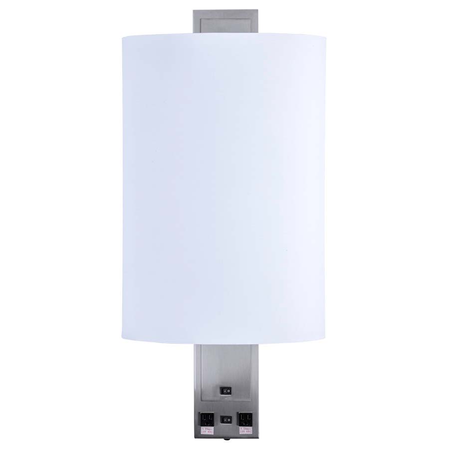 32.75"H Brushed Nickel and Polished Nickel Wall Lamp, 2- sockets, 2-on/off rocker switches at backplate, 8'Silver45°3-prg grounded cord out bottom, 2-outlets, 7x15x7x15x22 Oval White Linen HB Shade w/top&bottom diffusers. Recommend 2-1100 lumen LED bulbs.