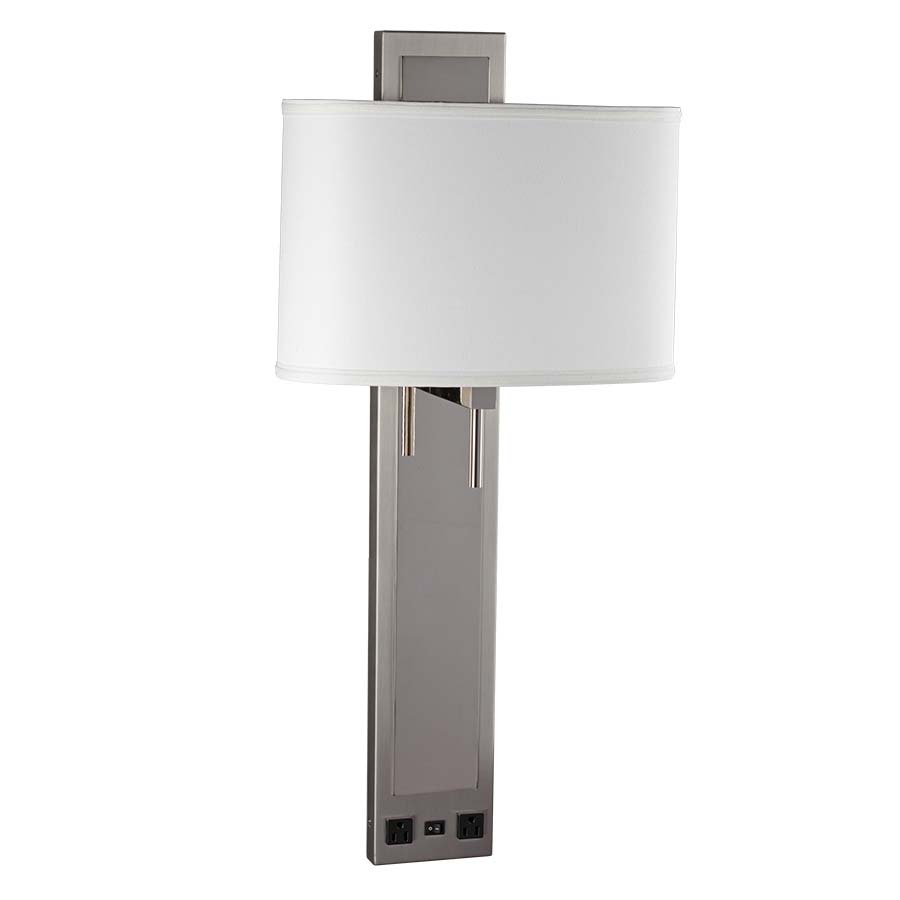 32.75"H Brushed Nickel & Polished Nickel Wall Lamp, medium base socket, on/off rocker switch at backplate, 8' Silver 45°3-prg grounded cord out bottom, two outlets, 7x15x7x15x10 Oval Cream Linen HB Shade w/tp&btm diffusers. Recommend 1100 lumen LED bulb.