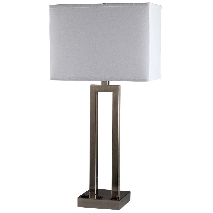 30"H Brushed Nickel Table Lamp, dual medium base socket, dual on/off rocker base switch, two convenience outlets, 8' Silver 45° 3-prong grounded cord, 8x15x8x15x11 Rectangle White Linen Hardback Shade, 10" Harp & Finial, Recommend two 1100 lumen LED bulbs. (dual rocker switch not shown in picture)