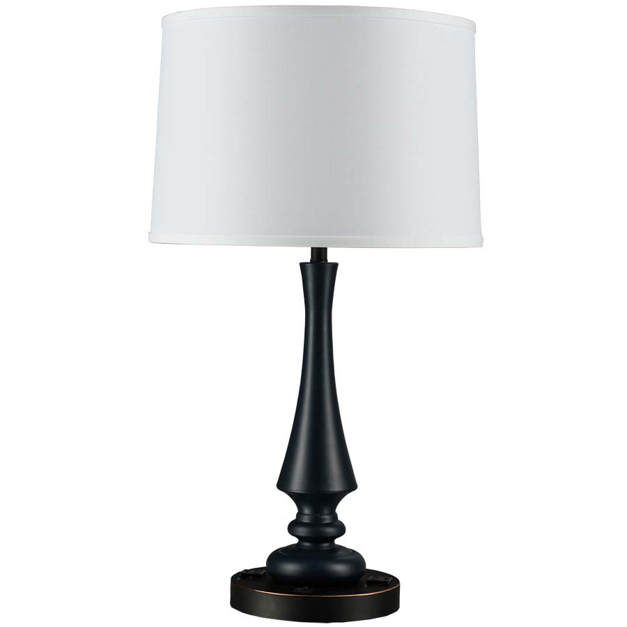 27"H Blue Black and Portland Bronze Table Lamp, medium base socket, on/off rocker base switch, 8' Silver 45° 3-prong grounded cord, two convenience outlets, 14x15x10 White Linen Hardback Shade. Recommend 1100 lumen LED bulb.