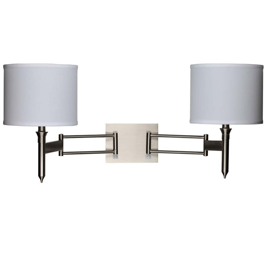 Brushed Nickel Double Wall Lamp, Heavy Duty Double Knuckled Swing Arms, 2- medium skts, 2-independent on/off rocker switches at back plate, 8' Silver 45° cord, 24" cord cover, 8x8x8 White Linen HB Shades/Bottom Diffuser.Recommend 2- 1100 lumenLED bulbs