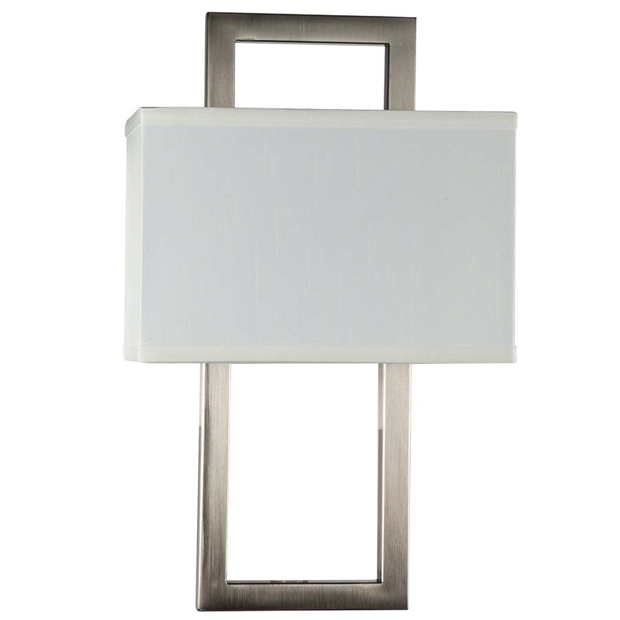 15.5"H Brushed Nickel Integrated LED Wall Lamp, two 10.5 Watt LED, 1680 lumen, 4100K, 80CRI, Direct Wired, With 4.75"x9.5"x6.25" White Faux Silk Shade.