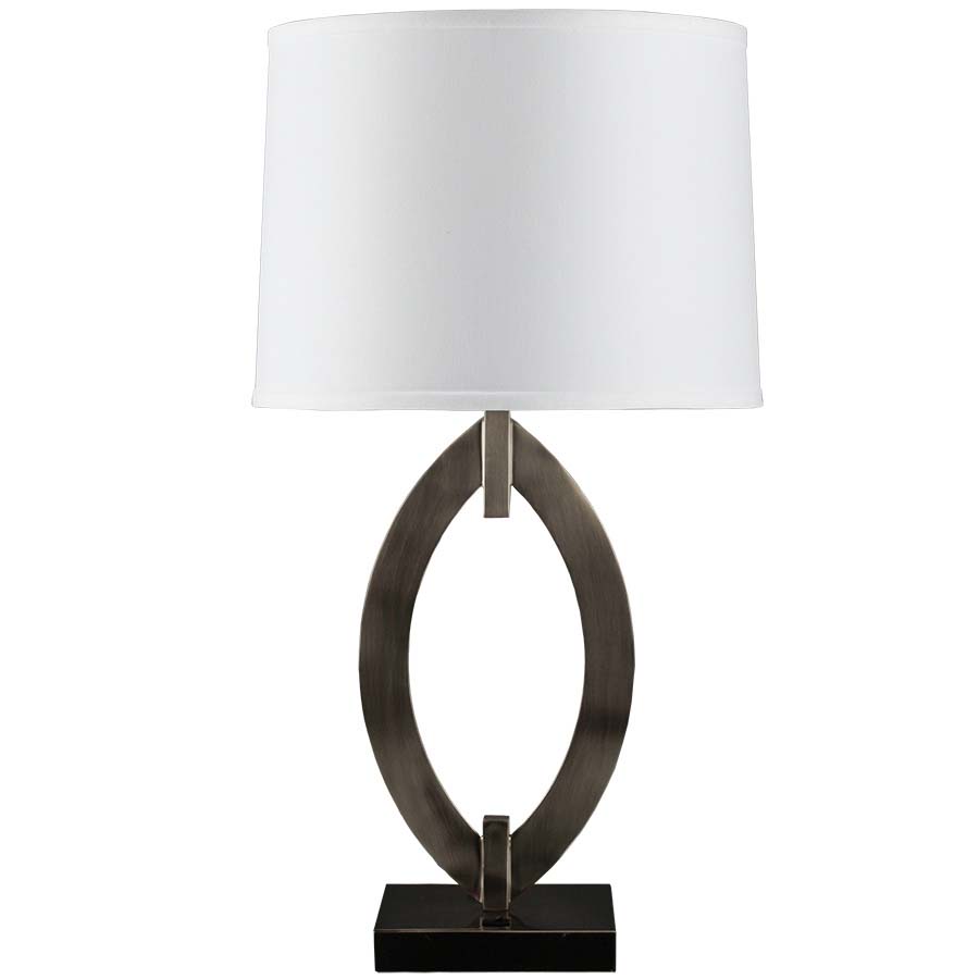 27" Brushed Nickel Table Lamp, dual medium base socket, dual on/off rocker base switch, 8' Silver 45° cord, 14"x15"x11" White Linen Hardback Shade, 8.5" Harp & Finial, recommend two 1100 lumen LED bulbs