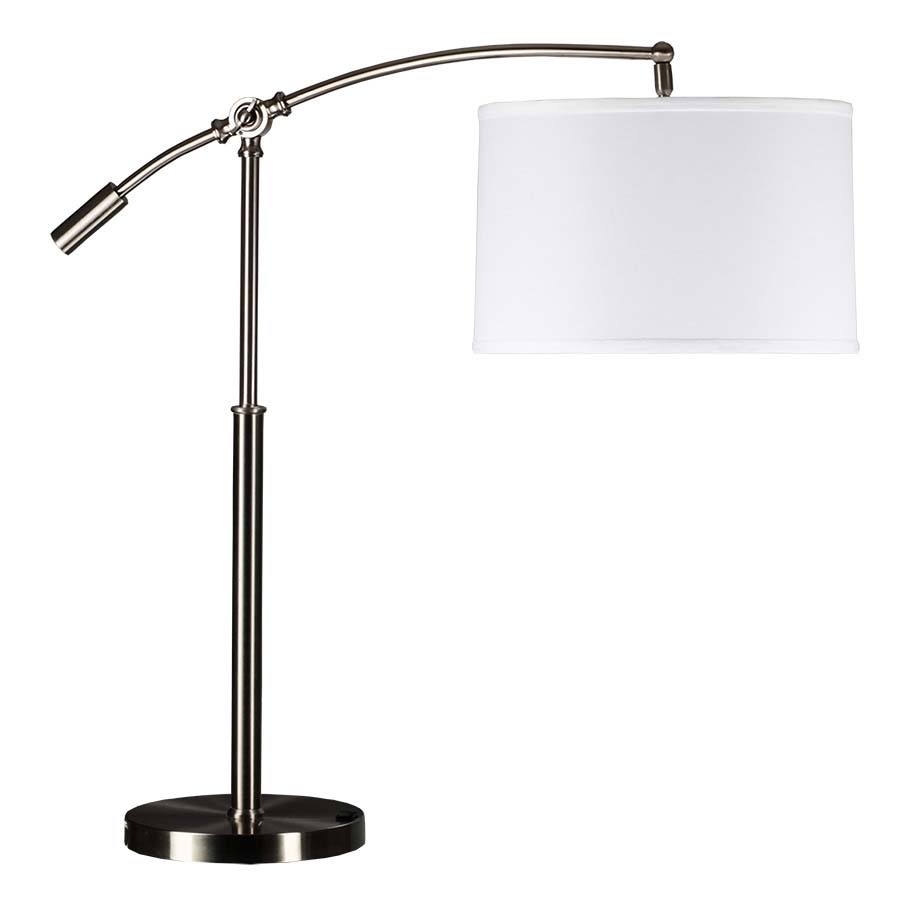 28" Brushed Nickel Bolt Down Table Lamp with fixed arm, medium socket, on/off rocker base switch, one outlet,12' Silver 45°3-prg grounded cord. 11x11.5x8 White Linen HB shade, Frosted White Acrylic Top Diffuser. Recommend 1100 lumen LED bulb