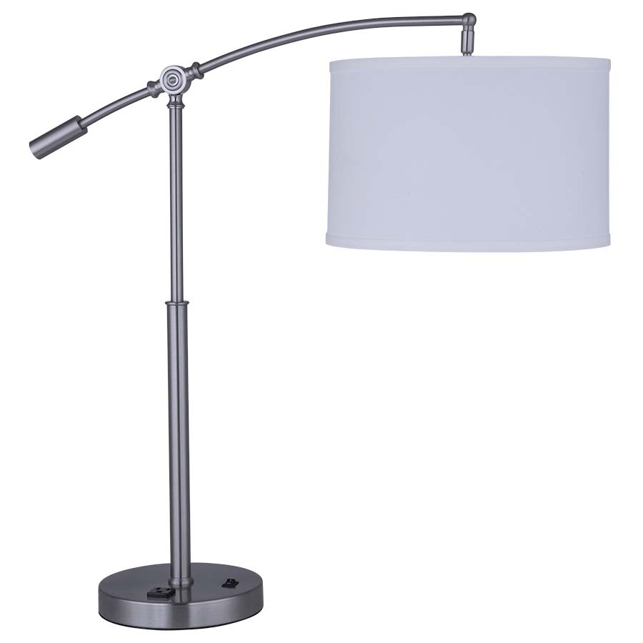 28" Brushed Nickel Table Lamp with fixed arm, medium socket, on/off rocker base switch, one outlet, 8' Silver 45° 3-pr grounded cord. 11x11.5x8 White Linen Hardback shade, Frosted White Acrylic Top Diffuser. Recommend 1100 lumen LED bulb.