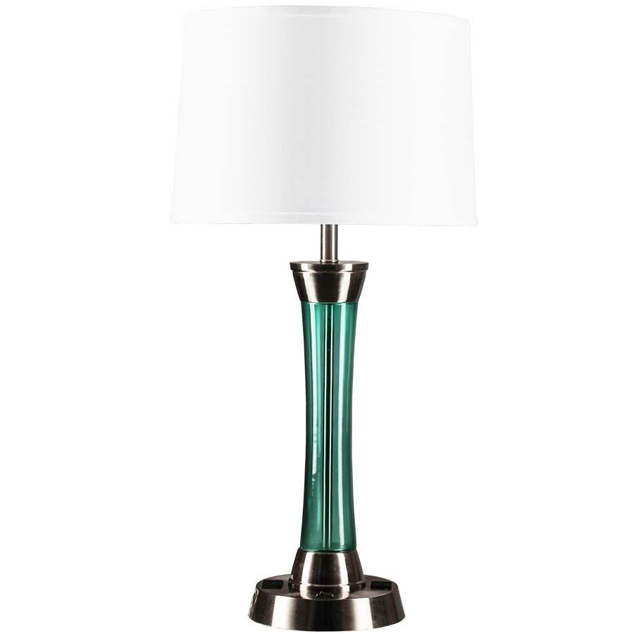 Brighten up your hospitality space with Arkansas Lighting's brushed nickel desk lamp with green glass. The table lamp features a white linen hardback shade.