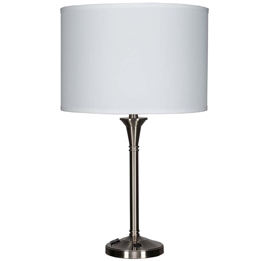 27" Brushed Nickel Table Lamp, medium base socket, on/off rocker base switch, one convenience outlet, 8' Silver 45° 3-prong grounded cord, with 16x16x11 White Linen Hardback Shade. Recommend 1100 lumen LED bulb.