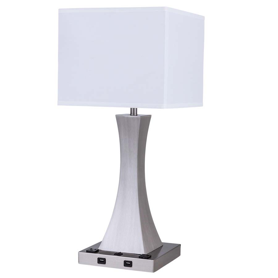 27.25" Brushed Nickel Table Lamp, medium base socket, on/off rocker base switch, two convenience outlets, two USB ports, 8' Silver 45° 3-prong grounded cord, with 12x12x12x12x10 Square White Linen Hardback Shade. Recommend 1100 lumen LED bulb.