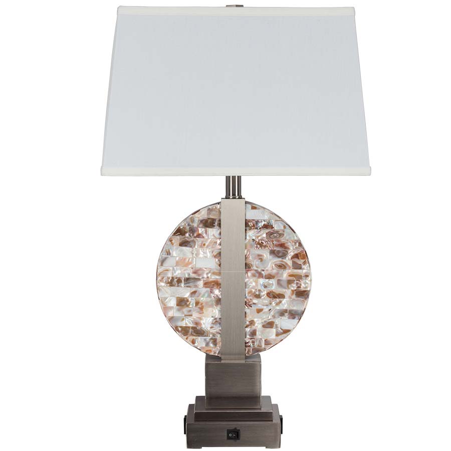 29" Brushed Nickel and Shell Table Lamp, medium base socket, on/off rocker base switch, two convenience outlets, 8' Silver 45° 3-prong grounded cord, 9x14x10x16x10 Rectangle White Linen Hardback Shade. Recommend 1100 lumen LED bulb.