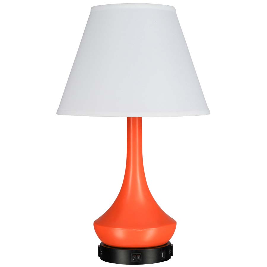 25" Matte Orange and Black Base Table Lamp, dual GU24 socket, dual on/off rocker base switch, two convenience outlets, dual USB port,8' Silver 45° 3-prong grounded cord, 8"x15"x11 White Linen HB Shade. Recommend two 1100 lumen LED bulbs with GU24 base.