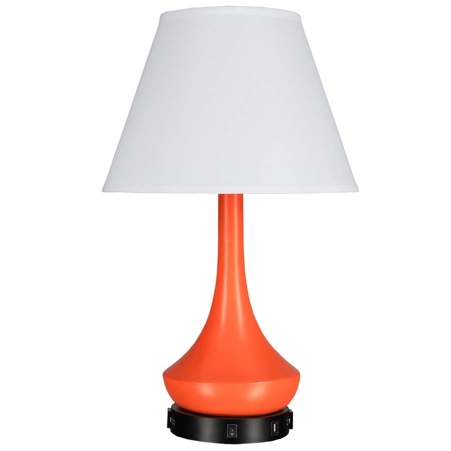 25" Matte Orange and Black Base Table Lamp, GU24 socket, on/off rocker base switch, two convenience outlets, dual USB port, 8' Silver 45° 3-prong grounded cord, 8"x15"x11 White Linen Hardback Shade. Recommend 1100 lumen LED bulb with GU24 base.