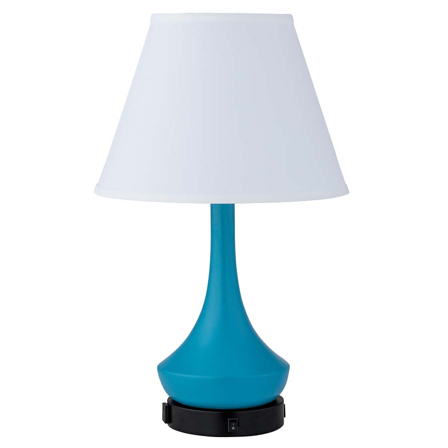 25" Aqua Sky and Matte Black Table Lamp, medium base socket, on/off rocker base switch, one outlet, dual USB port, 8' Silver 45° 3-prong grounded cord, 8"x15"x11" White Linen Hardback Shade with top acrylic diffuser, recommend 1100 lumen LED bulb.
