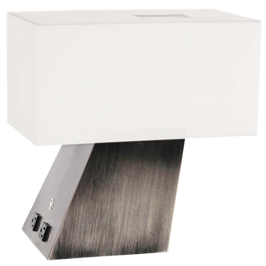 15" Brushed Nickel Pewter Table Lamp, medium base socket, on/off rocker base switch, two outlets on the right side, 8' Silver 45° 3-prong grounded cord, 8x14x8x14x7 Rectangle Translucent Cream Linen HB Shade. Recommend 1100 lumen LED bulb