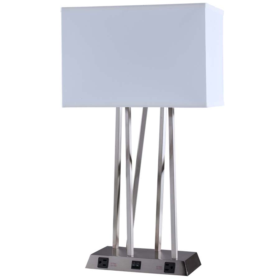 26" Brushed Nickel Table Lamp, dual medium base socket, dual on/off rocker base switch, two convenience outlets, 8' Silver 45° 3-prong grounded cord, 8x15x8x15x10 Rectangle White Linen Hardback Shade. Recommend two 1100 lumen LED bulbs.