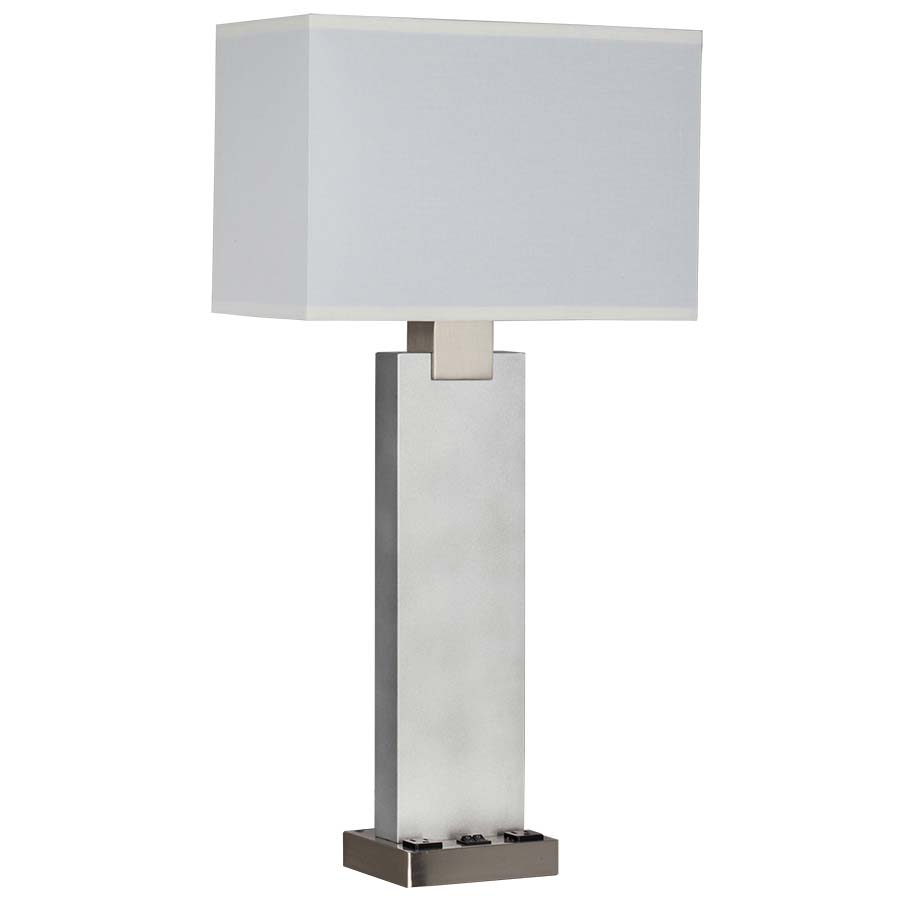 29" Silver and Brushed Nickel Table Lamp, with dual socket, dual on/off rocker base switch, 8' Silver 45°3-prg grounded cord, two convenience outlets. With 8"x14"x8"x14"x10" Rectangle White Linen Hardback Shade. Recommend two 800 lumen LED bulbs.