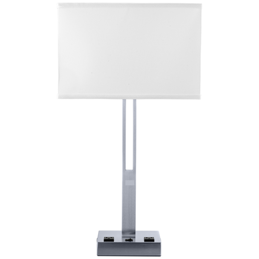 27.25"H Brushed Nickel Table Lamp, medium base socket, on/off rocker base switch, 8' Silver 45° 3-prong grounded cord, with two convenience outlets, two dual USB ports, includes 8"x15"x8"x15"x10" Rectangle White Linen Hardback Shade. Recommend 1100 lumen LED bulb.