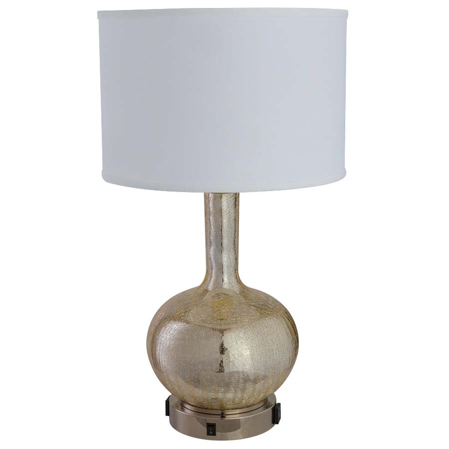 26.5" Polished Nickel and Champagne Crackle Glass Table Lamp, medium bases socket, on/off rocker base switch, two outlets, 8' Silver 45° angle 3-prong grounded cord, 15x15x10 White Linen Hardback Shade. Recommend 1100 lumen LED bulb.