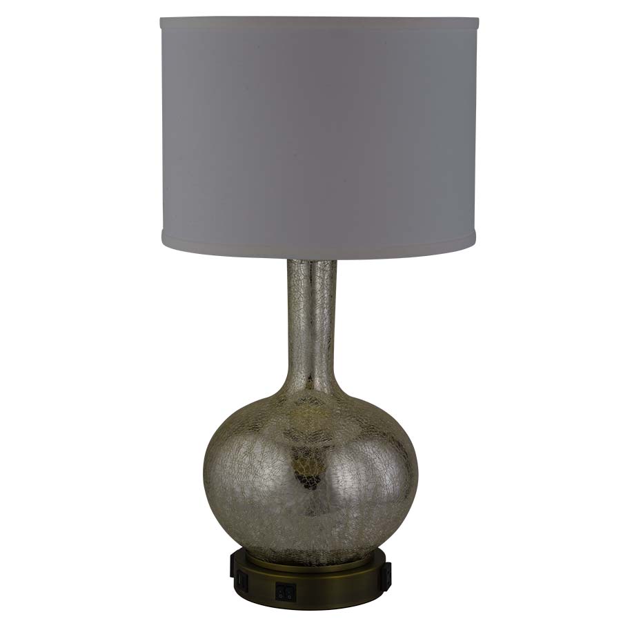 26.5"H Champagne Crackle Glass and Plated Brushed Brass Table Lamp, dual medium base socket, dual on/off rocker base switch, two outlets, dual USB port, 8' Silver 45° 3-prong grounded cord, 15"x15"x10" Cream Linen Hardback Shade, recommend two 1100 lumen LED bulbs