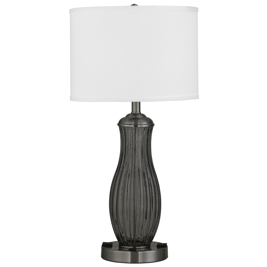 28.5" Brushed Nickel and Smoke Grey Glass Table Lamp, medium base socket, on/off rocker base switch, two outlets, 8' Silver 45° 3-prong grounded cord, 14x14x10 White Linen Hardback Shade. Recommend 1100 lumen LED bulb.