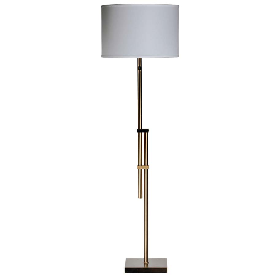 63"H Antique Brass Parallel Floor Lamp, medium base socket, on/off rocker switch on column @ 48"AFF, 11' Silver 45° cord, 18x18x12 White Linen Hardback Shade with bottom diffuser. Recommend 1100 lumen LED bulb.