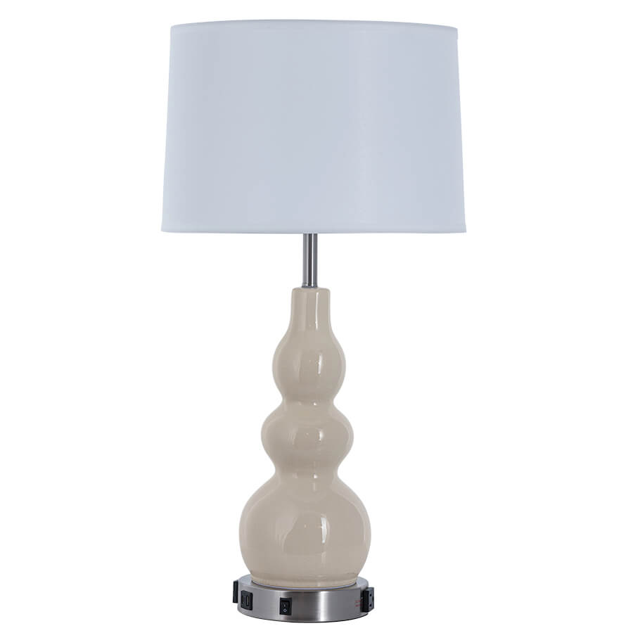 29" Ivory Crackle Ceramic and Brushed Nickel Table Lamp, medium base socket, on/off rocker base switch, with two convenience outlets, one USB and one USB-C port, 8' Silver 45° 3-prong grounded cord, with 14"x15"x10" White Linen Shade, 8.5" Harp & Finial, Recommend 1100 lumen LED bulb.