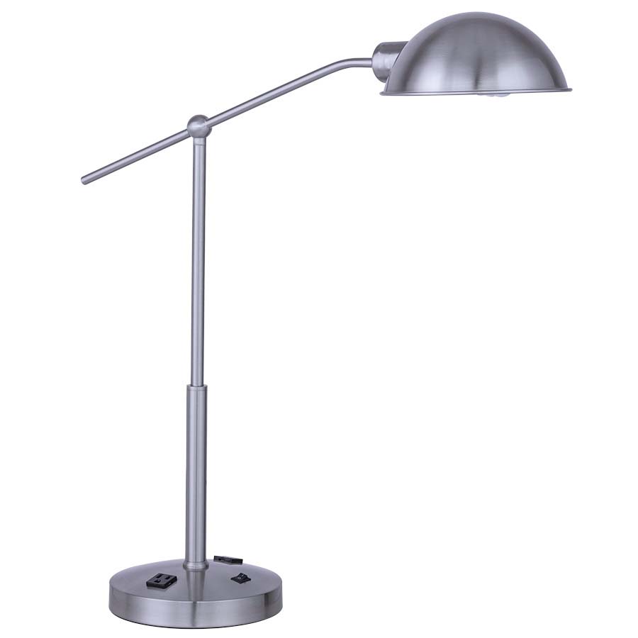 27"H Brushed Nickel Table Lamp with Extended Arm, medium base socket, on/off rocker base switch, two convenience outlets, 8' Silver 45° 3-prong grounded cord. Recommend 1100 lumen LED bulb.