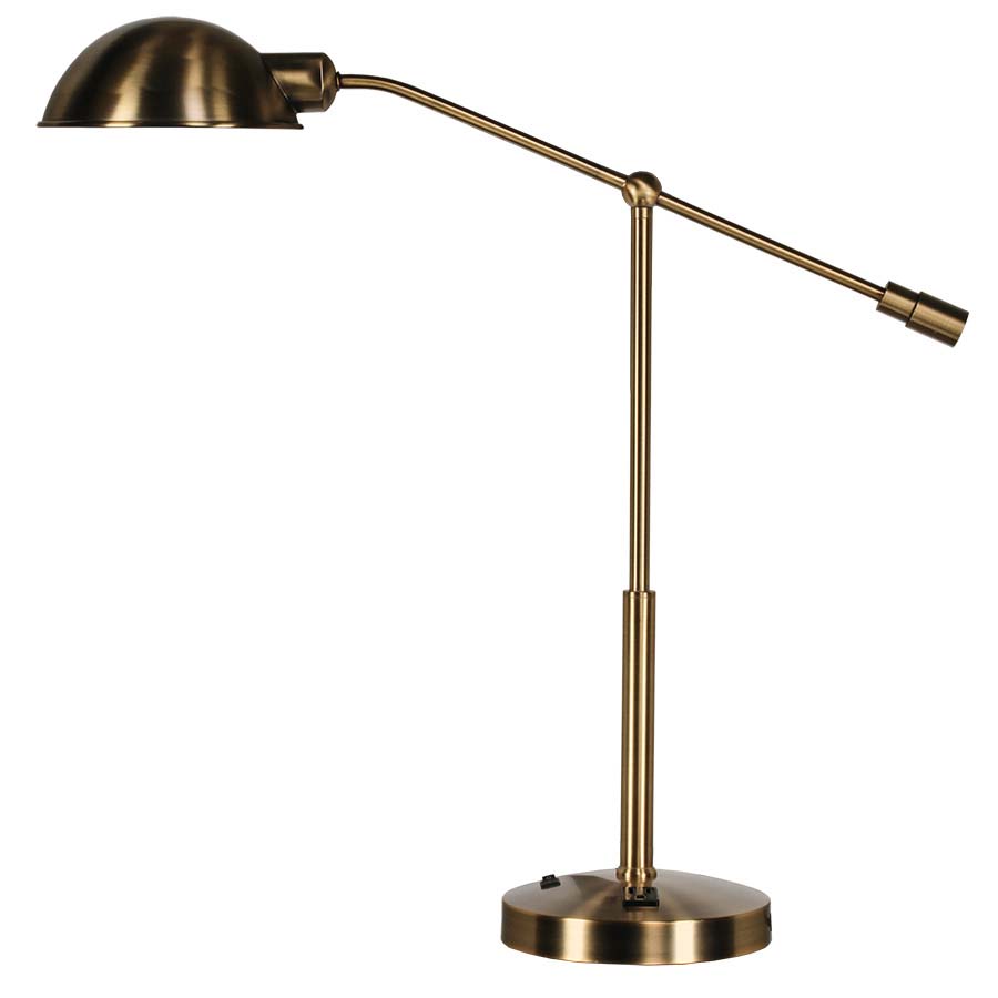 27"H Antique Brass Table Lamp with Extended Arm, medium base socket, on/off rocker base switch, two convenience outlets, 8' Silver 45° 3-prong grounded cord. Recommend 1100 lumen LED bulb.