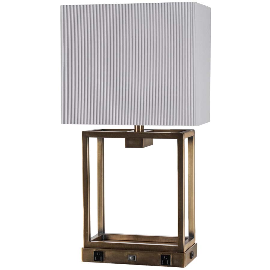 26" Brushed Brass Table Lamp, medium base socket, on/off rocker base switch, two outlets and one usb port, 8' Silver 45° 3-prong grounded cord, 8x14x8x14x12 Rectangle Gray Ribbed Hardback Shade. Recommend 1100 lumen LED bulb.