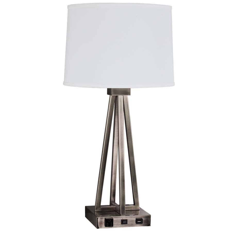 27.5" Pewter Brushed Nickel Table Lamp, medium base socket, on/off rocker base switch, with one outlet and dual usb port, 8' Silver 45° 3-prong grounded cord, 13x14x10 White Linen Hardback Shade. Recommend 1100 lumen LED bulb