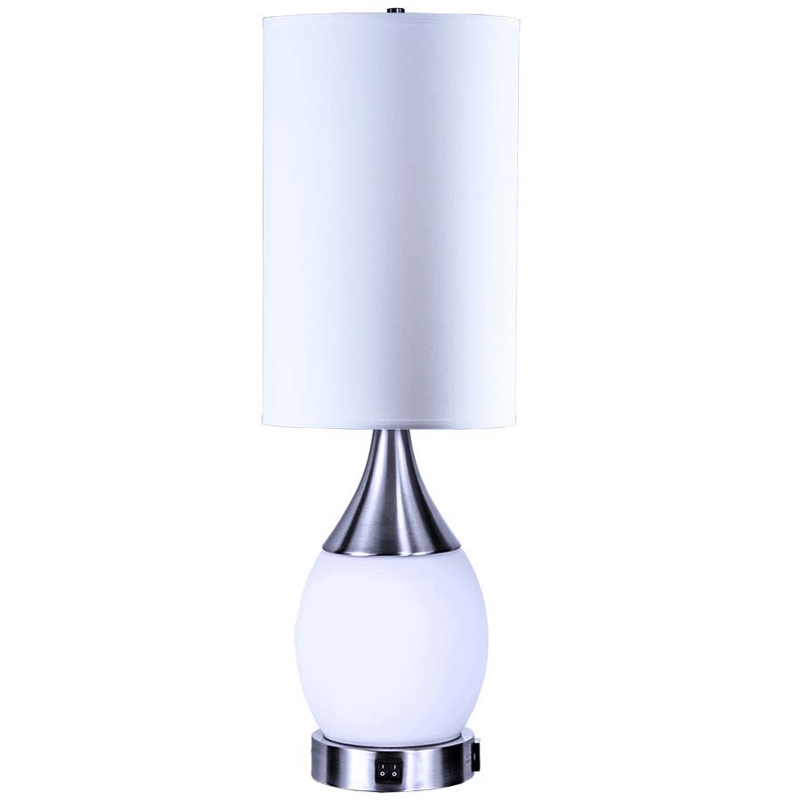 27"Brushed Nickel/Frosted Glass Table Lamp, one medium socket, LED night light candelabra socket in column (included), dual rocker base switch, one outlet, 8' 45°Silver 3-prg grounded cd, 9x9x14 White Linen HB shade,White Frosted Top Diffuser.
