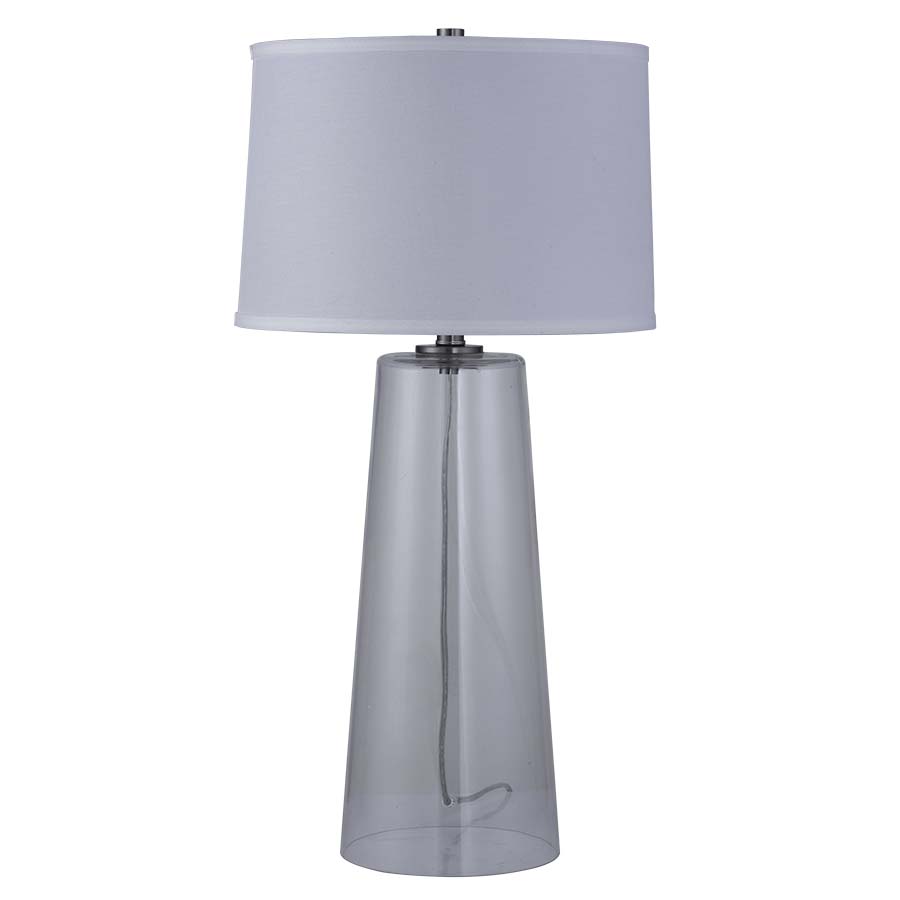 29-5/8"H Clear Glass Table Lamp with Brushed Nickel accents, medium base socket with push thru socket switch, 8' Silver 45° cord, 14"x14.5"x10" White Linen Hardback Shade, recommend 1100 lumen LED bulb
