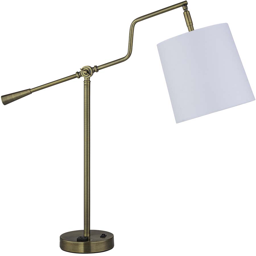 32-1/8"H Matte Black Swivel Table Lamp, with adjustable handle, medium base socket, on/off rocker base switch, 8' Silver 45° 3-prong grounded cord, one outlet, 8x9x9 White Linen Hardback Shade with Rolled Edges with top diffuser, Recommend 1100 lumen LED bulb.