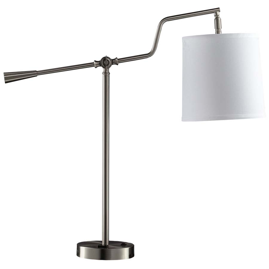 32-1/8" Brushed Nickel Swivel Table Lamp, with adjustable handle, on/off rocker base switch, 10' Silver 45° 3-prong grounded cord, with one convenience outlet, 8x9x9 White Linen Hardback Shade with Rolled Edges. Recommend 1100 lumen LED bulb.